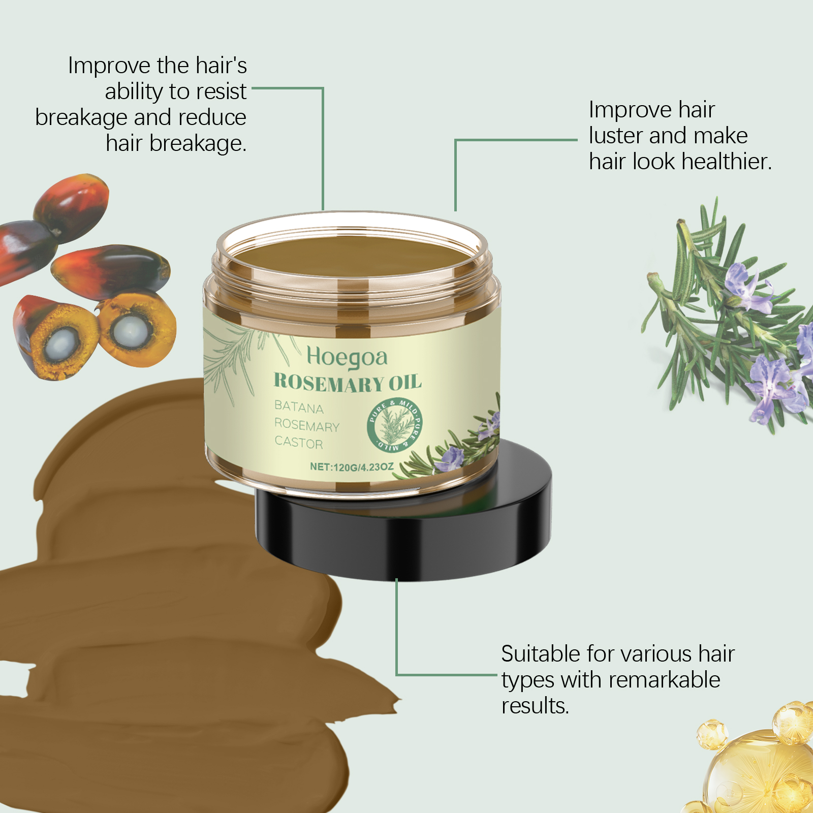Our rosemary hair balm contains castor oil and tocopherol. It can deeply nourish the scalp and roots of the hair and improve the overall health of the hair. Its use method is very simple: dry and clean hair, take appropriate amount of this product, evenly apply to the scalp and hair roots, gently massage until absorbed. And it can nourish the roots of the hair and strengthen the hair.