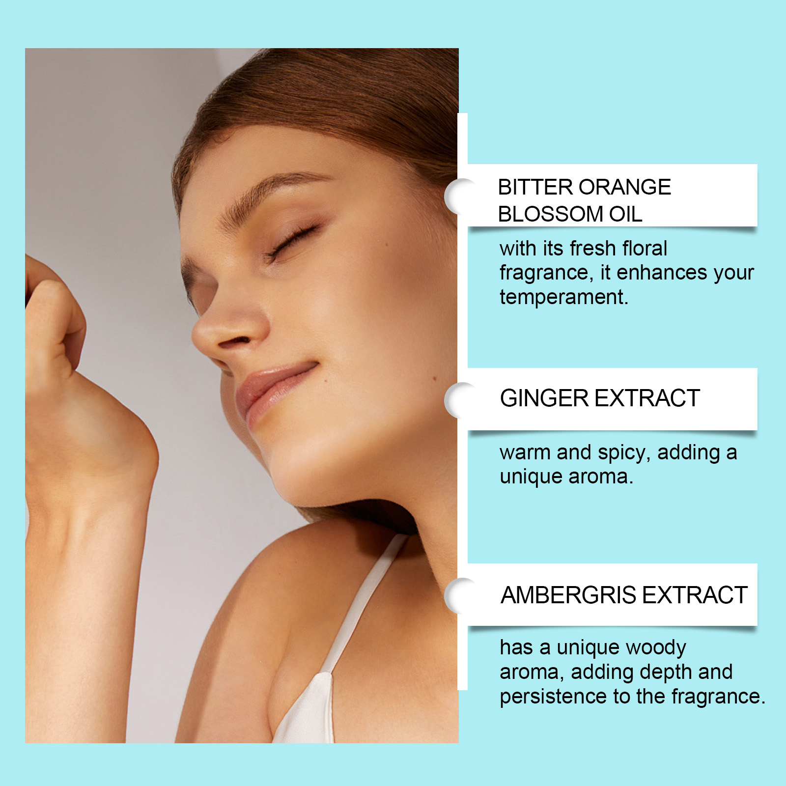 Our Amanita eau de Toilette contains denatured ethanol, PEG-40 hydrogenated castor oil. It can be rich in fragrance, show different charm at all times, fresh breath is constantly released, and you can feel the fragrance all day long. Its use method is very simple: gently spray the perfume on the wrist, neck, chest and other pulse points, each spray 1-2 times, to achieve the best perfume distribution effect. And can be elegant bottles, showing taste and charm.