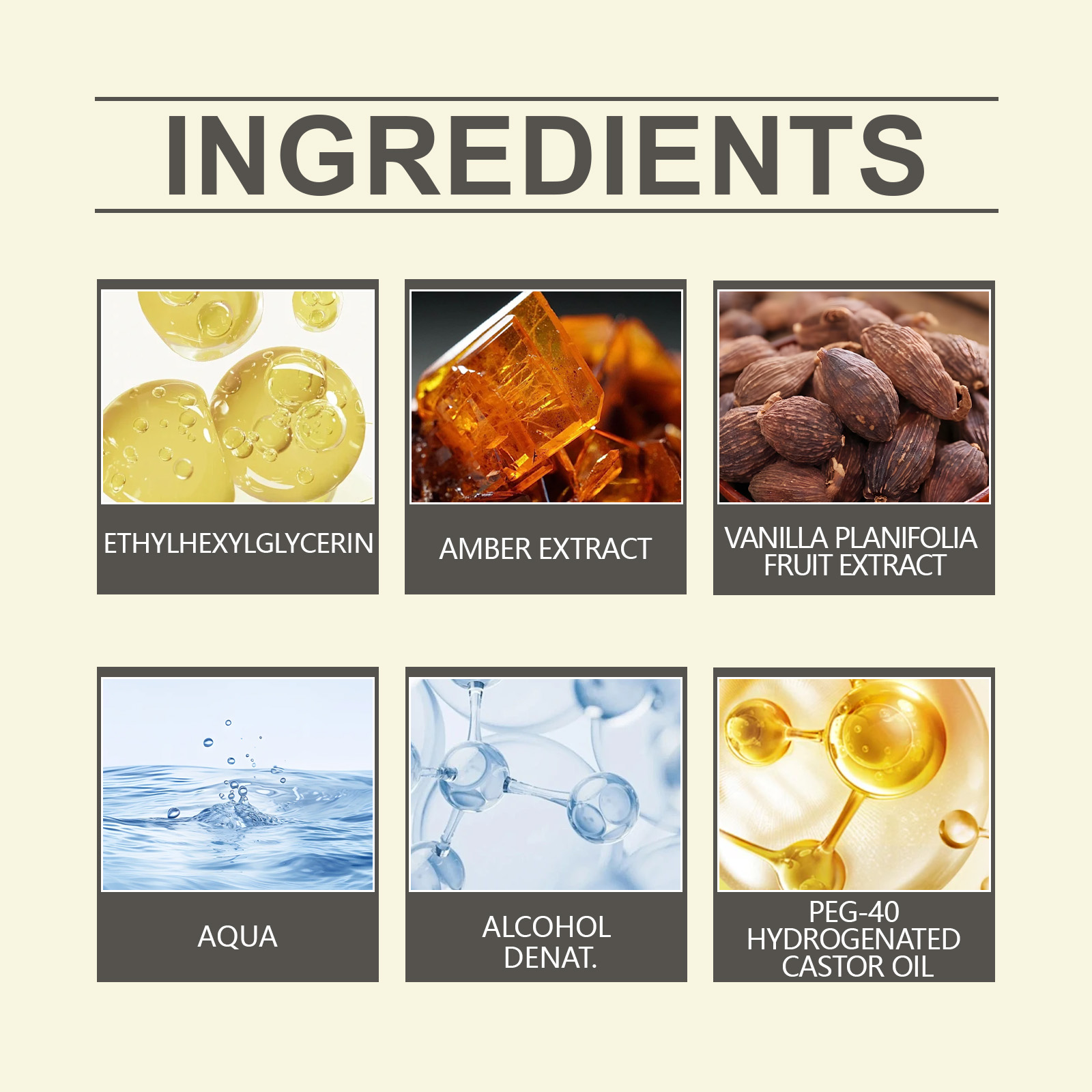 Our vanilla Amber Eau de Toilette contains denatured ethanol and PEG-40 hydrogenated castor oil. It can bring a refreshing and pleasant aroma with a fresh fruity taste, suitable for everyday life and special occasions. The warm amber undertone adds depth and durability to the perfume, exuding an elegant charm. Its application is simple: spray the perfume on the wrists, neck and behind the ears or spray the perfume into the air and into a mist, so that the perfume is evenly dispersed throughout the body, leaving a fragrant aroma. And can be long-lasting fragrance, all day long exudes charming fragrance.